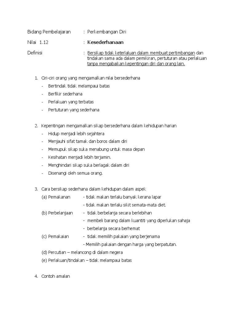 Nilai Kesederhanaan Pdf Tidak melakukan perbuatan yang melanggar agama. Sanggup melakukan apa sahaja untuk mengejar kemewahan. 15 Penutup Karangan kokurikulum mencungkil bakat pelajar.
